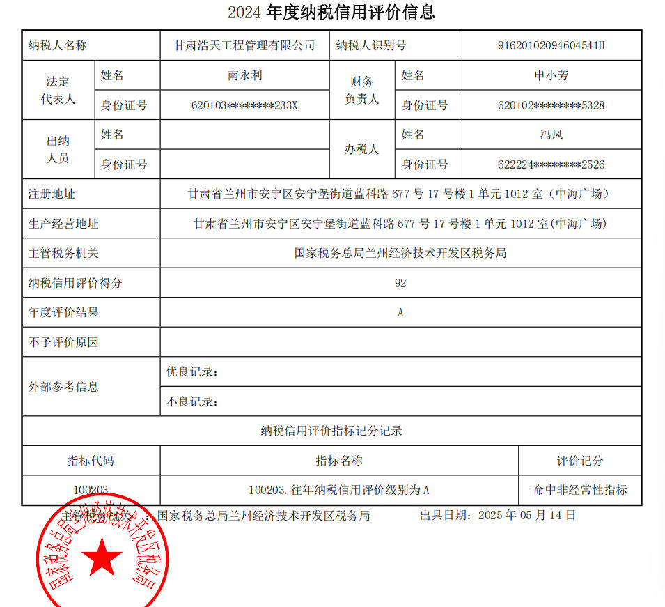甘肅浩天工程管理有限公司榮獲2024年度“納稅信用等級A級納稅人”稱號